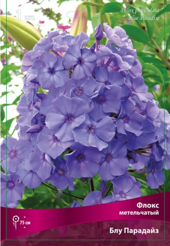 Блу Парадайс - высота растения 75 см. Куст полураскидистый, прочный, быстро разрастается. Соцветие округло-коническое, среднего размера и плотности. Цветок днем сиреневый, с темным лиловым колечком, в сумерки - синеет. Лепестки слегка волнистые. Сорт устойчив к заболеваниям. Один из самых ярких синих флоксов.