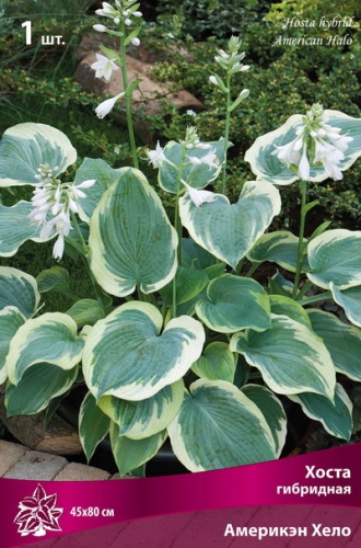 Америкэн Хело - высота куста 45 см, ширина 80 см. Листья сердцевидные, темно-зелено-голубые с неровной каймой от желтого до цвета слоновой кости, цветки белые.
