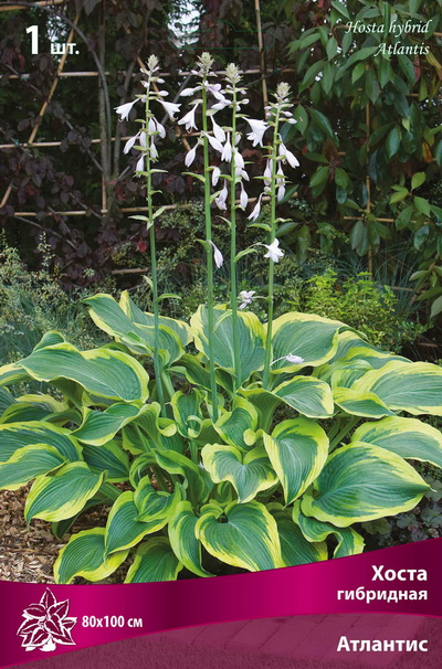 Атлантис - высота куста 80 см, ширина 100 см. Листья плотные, темно-зеленые с желтой каймой.