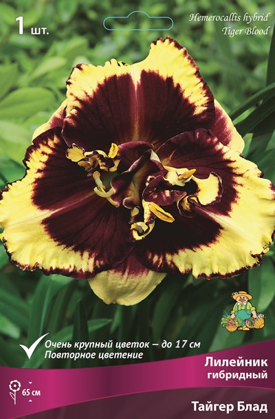 Тайгер Блад - высота растения 65 см. Цветок кремово-желтый с большим темно-бордовым центром и каймой.