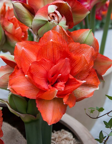 Амариллис махровый Бенито - изумительный нарядный сорт, станет центральной частью любой цветочной композиции, привнося радость и вдохновение своим присутствием. Растение высотой 50-70 см с ремневидными зелёными листьями и крупными махровыми цветками. На каждом цветоносе формируется от 2 до 4 цветков. Их великолепные двухслойные лепестки очаровывают ярким оранжевым цветом, который мягко меняется, создавая градиент и высветляя центральную часть лепестка. Каждый цветок достигает внушительных размеров — около 18 сантиметров в диаметре, превращаясь в истинное украшение любого интерьера. Сорт источает сладковатый аромат с цветочными нотками, способен поднять настроение, наполнив пространство энергией природы и удивительной красотой.