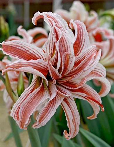 Амариллис махровый Дублет - двухцветный - настоящее чудо природы, идеальный выбор для тех, кто мечтает добавить немного романтики и изящества в своё окружающее пространство. Взрослое растение высотой 50-70 см. Из одной луковицы вырастает 1-2 цветоноса, каждый из которых несёт по 2-4 цветка. Цветы махровые, достигающие впечатляющих размеров до 18-22 см в диаметре, отличаются наличием множества слоёв лепестков, образующих густое цветное облако. Лепестки волнистые, красиво закрученые. Малиново-розовые оттенки гармонично сочетаются с кремово-белыми элементами, оттеняя природную красоту растения. Широкая глянцевая зелень листьев подчеркивает оригинальность цветков, дополняя общий ансамбль эффектной деталью. Использование амариллисов в букетах и композициях придаёт пространству особый шик и привлекательность, превращая обычные моменты в незабываемые события. Красота и очарование Doublet делают его идеальным выбором для украшения праздников, мероприятий и повседневных моментов, наполняя жизнь яркими красками и позитивными эмоциями.
