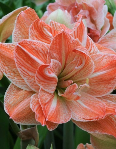 Амариллис махровый Экзотик Нимф - один из самых очаровательных сортов амариллиса, который поражает необыкновенной красотой и привлекает внимание своим уникальным цветом. Растение высотой 50-70 см. На стройных цветоносах формируется от 2-х до 4-х цветков. Цветки крупные, до 22 см в диаметре, густомахровые, сочетают в себе нежные кремово-белые и персиковые оттенки, украшенные яркими коралловыми прожилками. Лепестки волнистые, благодаря чему цветок выглядит ещё более объёмным и элегантным. Цветоносы сорта крепкие и устойчивые, что позволяет цветкам долго сохранять свою декоративность. Сорт идеально подходит для выращивания в горшках, станет отличным украшением любого интерьера и создаст атмосферу уюта и гармонии, привнося в дом радость и вдохновение.