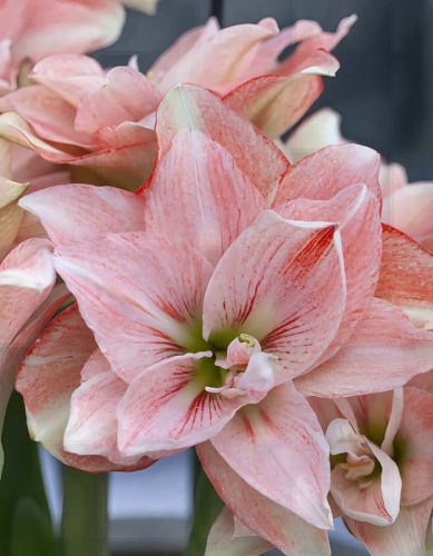 Амариллис махровый Пинк Глори - эффектный изысканный сорт, отличающийся красотой и элегантностью. Растение высотой 50-70 см. Из одной луковицы формируется 1 или 2 цветоноса с двумя или четырьмя цветками. Цветы имеют нежно-розовую основу с более насыщенными розовыми прожилками и едва заметными кремовыми бликами, что создаёт изысканный, романтичный эффект. Диаметр цветка колеблется от 15 до 20 сантиметров. Благодаря удивительному сочетанию цветов и махровым лепесткам этот цветок радует глаз, вызывает восхищение и приносит радость тем, кому посчастливилось его увидеть. Любители садоводства и цветоводы по достоинству оценят «Pink Glory» за его уникальные свойства и способность превращать любое пространство в яркий и чарующий оазис.