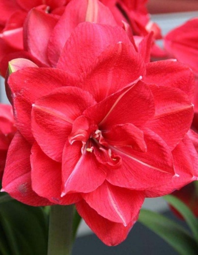 Амариллис махровый Пинк Симфони - потрясающий сорт, отличающийся нежными, романтичными цветами. Высота растения 50-70 см. Из одной луковицы формируется 1-2 цветоноса с двумя-четырьмя большими цветками. Крупные цветки диаметром 18—20 сантиметров обладают изысканным ароматом и красивым внешним видом. Нежные лососёво-розовые лепестки украшены едва заметными белыми вкраплениями, создающими гармоничный эффект, ассоциирующийся с утончённой элегантностью и очарованием. Гладкая текстура лепестков подчеркивает мягкость цвета, а зеленый оттенок у основания добавляет глубины общему образу. Это сочетание делает амариллис идеальным выбором для любого домашнего уголка и сезонной цветочной композиции, привнося красоту и эстетическое удовольствие в каждый уголок пространства. Цветение приходится на конец зимы и начало весны — время, когда световой день увеличивается, а растение просыпается после периода покоя. Pink Symphony - замечательный сорт, способный подарить ощущение тепла и уюта даже в самые холодные зимние дни.