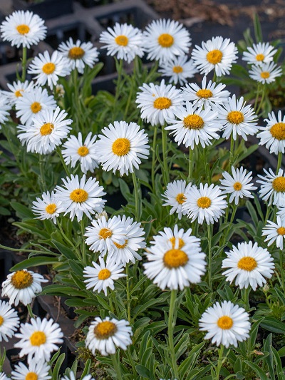Альба - розетка компактная высотой 20-40 см. Цветы белые с жёлтым центром. Цветение обильное. Идеально подходит для альпийской горки.