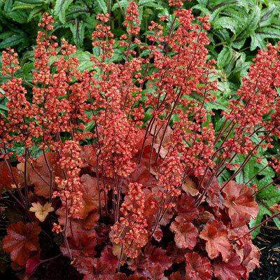 Гейхера гибридная: сорта данной группы цветут продолжительнее до двух месяцев и обильнее белыми, розовыми, коралловыми, красными цветками. Листья в основном зеленые, с контрастным жилкованием или с белым и кремовым крапом. Цветущие растения производят впечатление праздничного фейерверка, придавая живописную легкость цветникам. Единственным недостатком можно считать полегание цветоносов с большим количеством цветков от дождей и ветра.