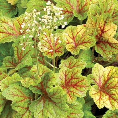 Гейхера гибридная: сорта данной группы цветут продолжительнее до двух месяцев и обильнее белыми, розовыми, коралловыми, красными цветками. Листья в основном зеленые, с контрастным жилкованием или с белым и кремовым крапом. Цветущие растения производят впечатление праздничного фейерверка, придавая живописную легкость цветникам. Единственным недостатком можно считать полегание цветоносов с большим количеством цветков от дождей и ветра.