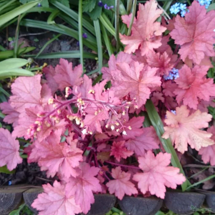 Гейхера гибридная: сорта данной группы цветут продолжительнее до двух месяцев и обильнее белыми, розовыми, коралловыми, красными цветками. Листья в основном зеленые, с контрастным жилкованием или с белым и кремовым крапом. Цветущие растения производят впечатление праздничного фейерверка, придавая живописную легкость цветникам. Единственным недостатком можно считать полегание цветоносов с большим количеством цветков от дождей и ветра.