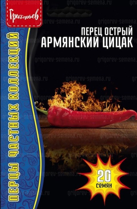 Лучший для приготовления популярной армянской закуски «Цицак» из квашеных или солёных перцев! Среднеспелый острый сорт народной селекции. Имеет пониженный уровень остроты по сравнению с чили, в меру сладкий, подходит для салатов и маринадов. Растение крепкое, среднеоблиственное, высотой до 80 см. Плоды ярко-красные, удлинённо-конусовидные, слабоизогнутые, длинной до 20 см, массой до 50 г. Толщина стенки до 5 мм. Вкус перчиков остро-сладкий. Отлично подходит для приготовления пикантной ароматной домашней приправы, салатов, консерваций. Содержит массу витаминов, антиоксидантов и микроэлементов.